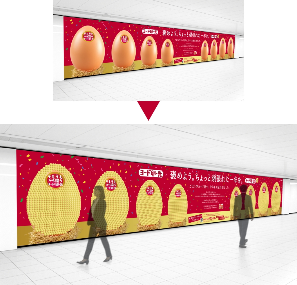 「今年一年で自分を褒めたいこと」を貼ることで新宿に金の卵が完成!Qoilが「ヨード卵・光」の体験型広告をプロデュース