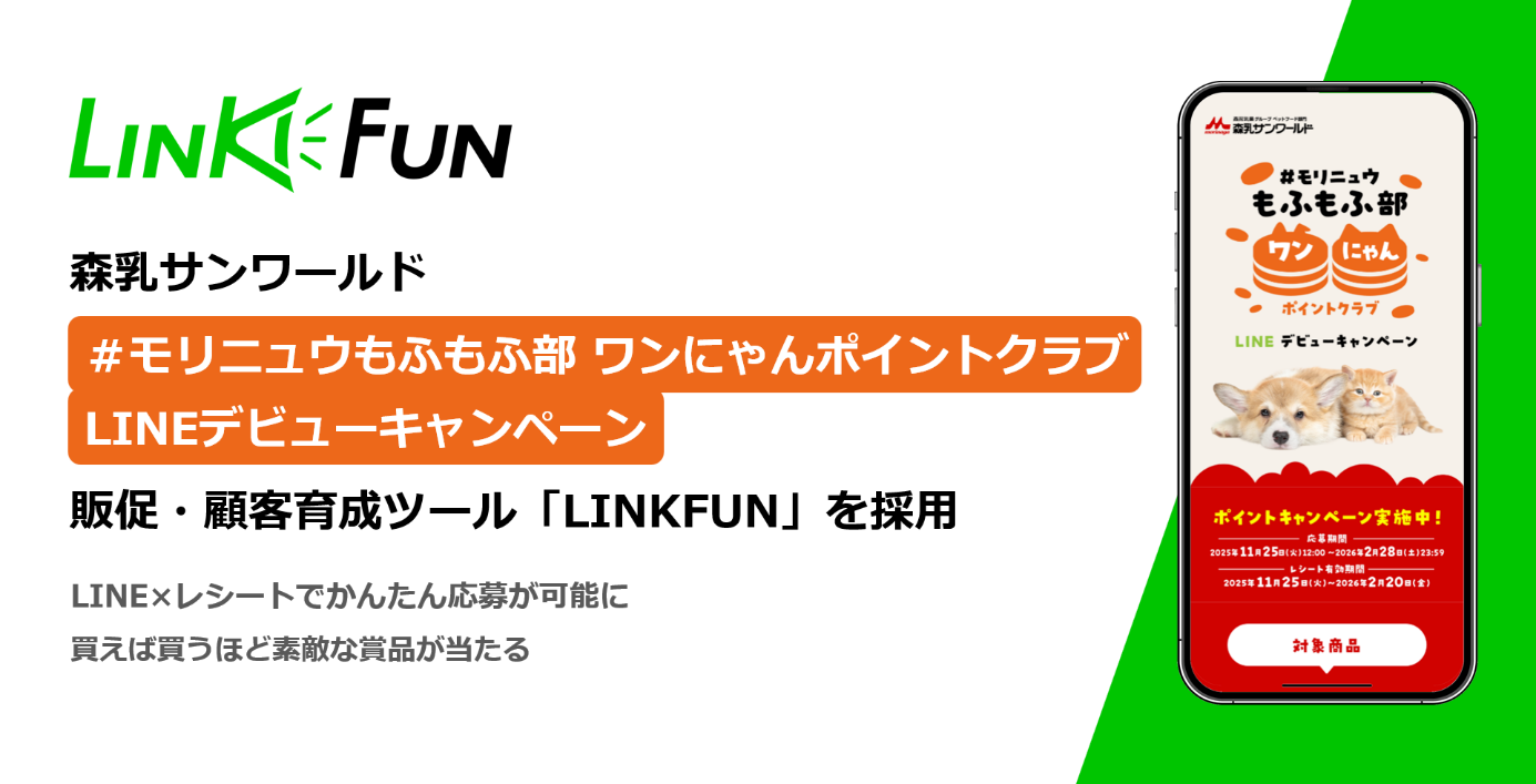 株式会社アイリッジ(本社:東京都港区、代表取締役社長:小田 健太郎、東京証券取引所グロース:3917、以下「アイリッジ」)とアイリッジの連結子会社でマーケティングに関するコミュニケーションデザイン事業を展開する株式会社Qoil(読み:コイル、本社:東京都港区、代表取締役社長:山下 紘史、以下「Qoil」)は、両社が提供するLINEを活用した販促・顧客育成ツール「LINKFUN」が、株式会社森乳サンワールド(本社:東京都港区、以下「森乳サンワールド」)に採用され、2025年11月25日より「#モリニュウもふもふ部 ワンにゃんポイントクラブ LINEデビューキャンペーン」が開始されたことをお知らせします。